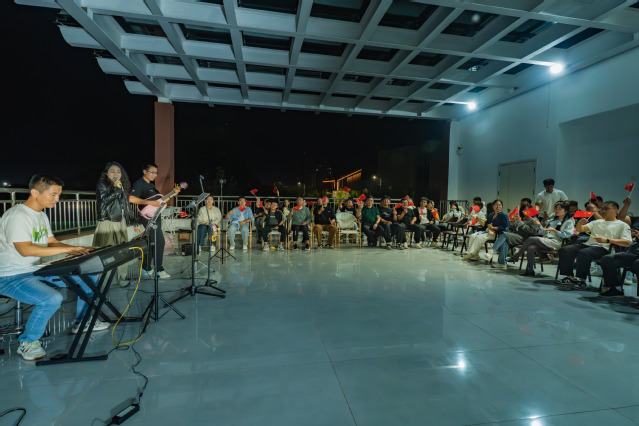 傍晚时分,活动在温馨愉快的氛围中进入尾声。大家齐聚一堂,享受自助烧烤的美味,聆听乐队的动人演唱。多位教职工更是踊跃登台,展示了个人才艺,将现场气氛推向高潮。最后,伴随着熊熊燃起的篝火,全体人员手拉手围成圆圈,跳起了欢快的兔子舞和丽江三部曲。在跳跃的火光与动感的旋律中,一天的疲惫得以释放,彼此的友谊进一步升华。