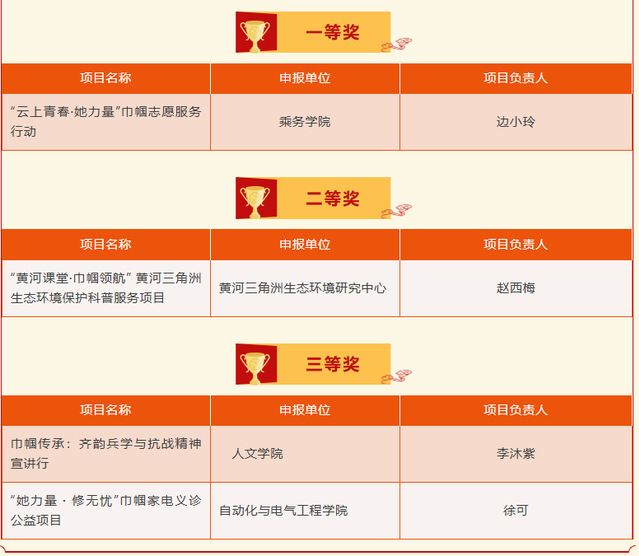 本次大赛的成功举办,是学校践行社会主义核心价值观、深化新时代文明实践的重要举措,有效激发了广大女性师生参与志愿服务的热情,展现了新时代山航院女性的担当与风采。评选出的优秀项目不仅在校内树立了标杆,还在滨州市巾帼志愿服务项目大赛中喜获佳绩,进一步扩大了我校巾帼志愿服务工作的影响力,推动志愿服务工作再上新台阶。希望各分会和广大师生以获奖团队为榜样,继续弘扬“奉献、友爱、互助、进步”的志愿精神,不断拓展服务领域,创新服务模式,打造服务品牌,为服务国家战略、助力社会治理、促进校地融合发展贡献更多山航院巾帼智慧和力量。