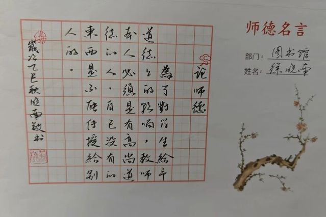 为加强图书馆分会教职工职业道德建设,大力弘扬高尚师德,图书馆分会开展了以“体悟师德名言,铸就高尚师德”为主题的师德名言书写活动,此活动旨在引导教职工在书写作品的过程中,深入领会师德名言蕴含的师德精神,将外在的名言转化为内在的道德追求,从而不断提升自身的师德修养。
