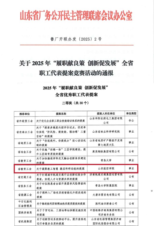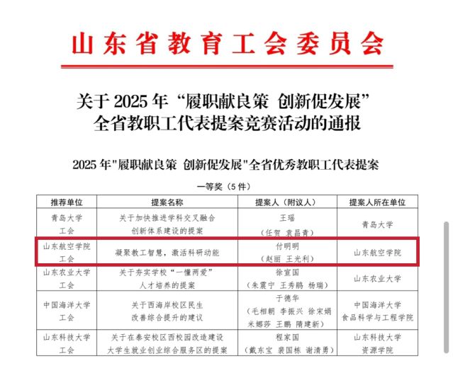 近日,2025年“履职献良策 创新促发展”全省教职工代表提案竞赛结果正式公布。我校工会推送的《凝聚教工智慧 激活科研动能》提案荣获省级一等奖。本次竞赛共评选一等奖5项,我校与青岛大学、山东农业大学、中国海洋大学、山东科技大学等共同获此殊荣,充分彰显了我校在民主治校、科学决策方面的思考深度与建言质量。另,我校此提案与青岛大学相关提案代表山东省教育工会参加了全省职工代表提案竞赛,再获省级二等奖,进一步体现了我校教职工立足大局、服务发展的参与意识和履职能力。