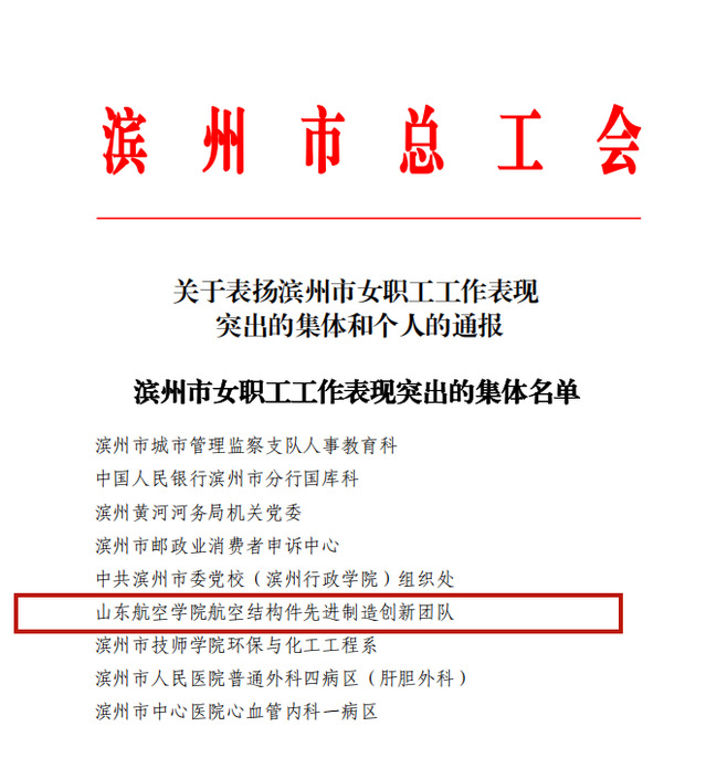 近日,滨州市总工会发布《关于表扬滨州市女职工工作表现突出的集体和个人的通报》,我校航空结构件先进制造创新团队凭借在科研创新、人才培养和社会服务等方面的卓越表现,荣获“滨州市女职工工作表现突出的集体”称号。
