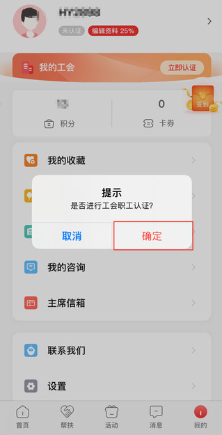②注册后第一次跳转到首页,弹出弹窗提示用户立即认证。点击确定,跳转至职工认证页面,如图;点击取消,弹窗消失。